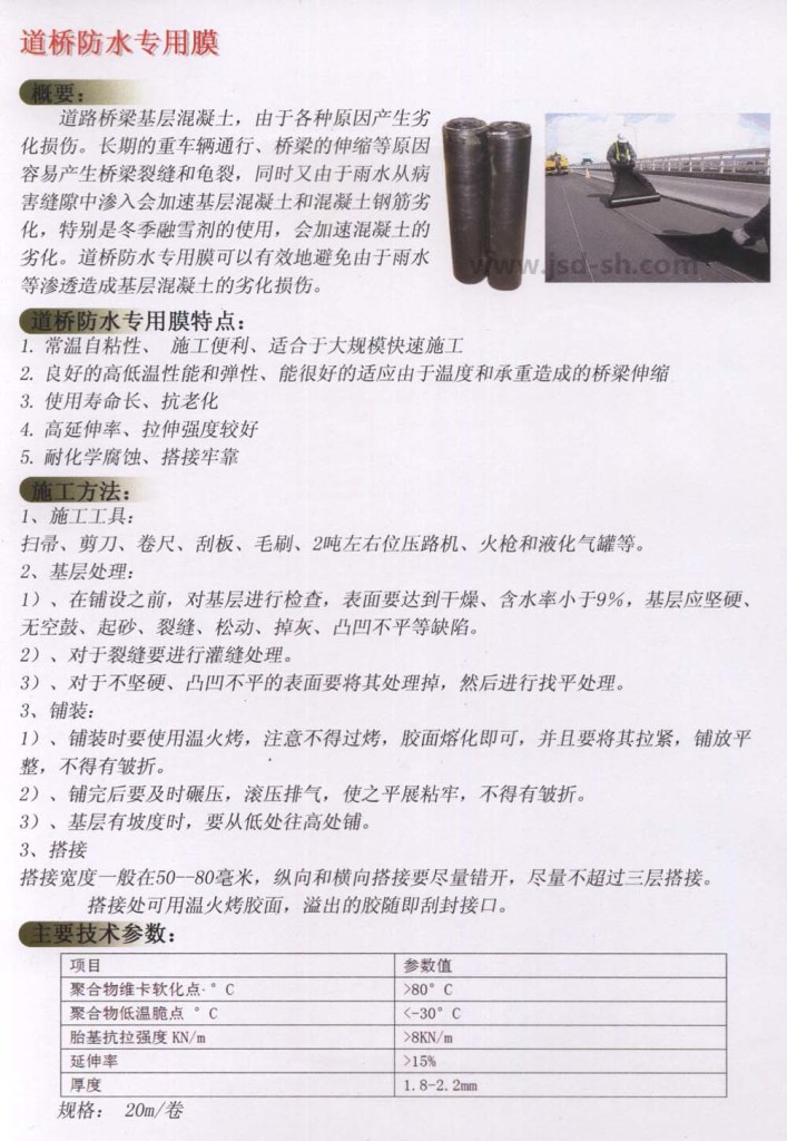 道路桥梁基层混凝土由于各种原因产生退变损伤,长期的重载车辆碾压,桥梁的伸缩等原因容易产生桥梁裂缝和龟裂,再加上雨水和冬季融雪剂的渗入会加速基层混凝土和钢筋的劣化。道桥防水专用膜可以有效的避免雨水等渗透造成基层混凝土的劣化损伤。