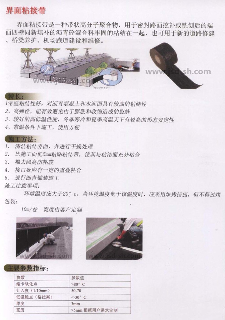 是一直带状高分子聚合物,用于密封道路挖补或铣刨后的端面四壁老的路面同新填补的沥青混凝土有机结合在一起,常常用于新建的桥梁、道路和机场等摊铺时使用。